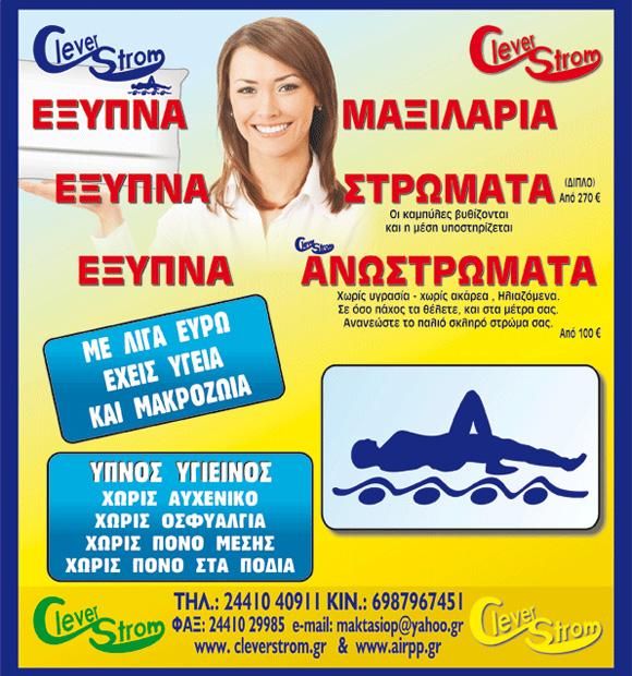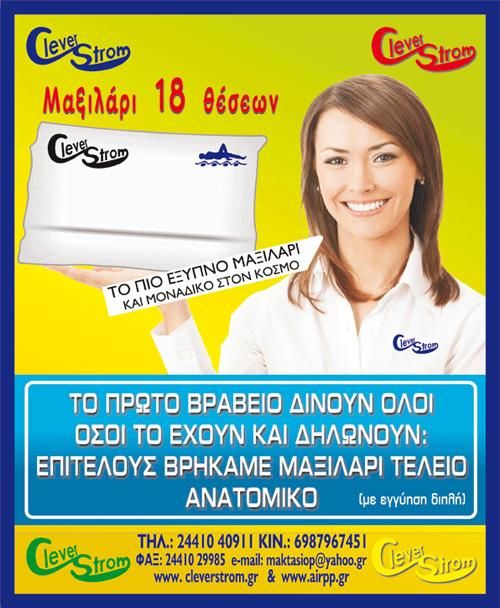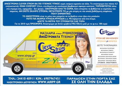 Η Clever Strom λειτουργεί στην πόλη της Καρδίτσας από το 1988, διαθέτοντας ανατομικά στρώματα και μαξιλάρια, μοναδικού σχεδιασμούκαι κορυφαίας ποιότητας. Όλη η φιλοσοφία της εταιρείας κινείται γύρω από την ανάγκη για υγιεινή ζωή και σωστή στάση του σώματός μας, καθ’ όλη τη διάρκεια της ημέρας. Τα προϊόντα της Clever Strom διανέμονται σε ολόκληρη την Ελλάδα και την Ευρώπη.